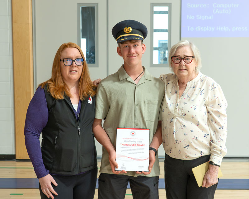 On June 10, Maga’s brave actions were formally recognized when he received a Red Cross Rescuer Award, one of the organization’s honours for exceptional lifesaving efforts. Fittingly, the award ceremony was held at his school Holy Cross Collegiate, where both of his godparents work and helped coordinate the special assembly. There, Gail presented Mitch with Len’s uniform hat – an item he now wears with pride.